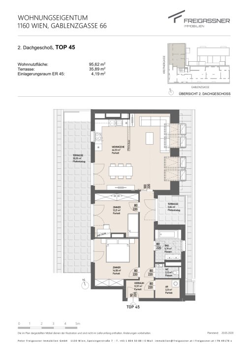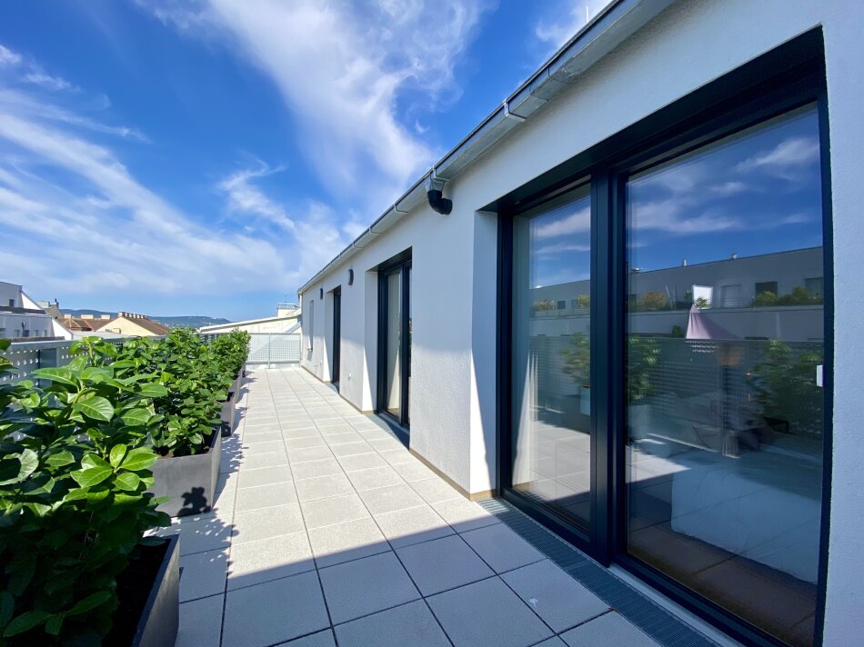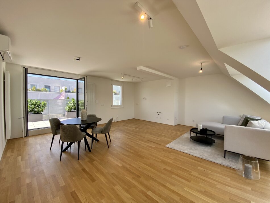 Die Dachgeschosswohnung befindet sich im 5. Liftstock und überzeugt vor allem durch hochwertige Ausstattung wie Echtholz- Eichenparkettboden, Klimaanlage und Feinsteinfließen in den Nassräumen. Das Objekt verfügt auch über eine Tiefgarage in der ein Stellplatz erworben werden kann. Im Haus befindet sich auch der zugehörige Einlagerungsraum mit 4,19m², ein Fahrradabstellraum, sowohl als auch ein Kinderwagenraum.