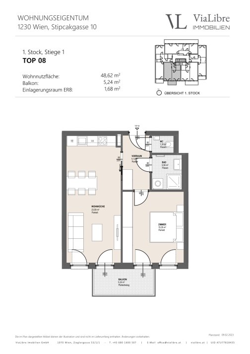 Für nähere Informationen sowie einen Besichtigungstermin stehen wir Ihnen gerne unter +43 680 1600 507 und unter office@vialibre.at zur Verfügung. Wir weisen ausdrücklich darauf hin, dass eine Besichtigung der Baustelle ausnahmslos nur nach Terminvereinbarung stattfinden kann. Das Betreten der Baustelle aus Eigenem bzw. für betriebsfremde Personen ist untersagt! Eine etwaige Objektbesichtigung erfolgt auf eigene Gefahr. Sämtliche Verkaufspläne sind unter vialibre.at abrufbar.